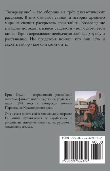 "Возвращение" - это сборник из трёх фантастических рассказов. В них оживают сказки, а история древнего мира не спешит раскрывать свои тайны. Возвращение к нашим истокам, к нашей сущности - вот основа этой книги. Герои переживают необычную любовь, дружбу и расставание. Им предстоит понять, кто они есть и сделать выбор - кем они хотят быть.