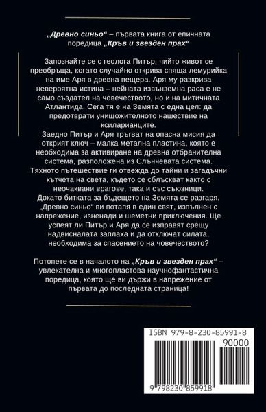 "Древно синьо" - първата книга от епичната научнофантастична поредица "Кръв и звезден прах" Запознайте се с геолога Питър, чийто живот се преобръща, когато случайно открива спяща лемурийка на име Аря в древна пещера. Аря му разкрива невероятна истина - нейната извънземна раса е не само създател на човечеството, но и на митичната Атлантида. Сега тя е на Земята с една цел да предотврати унищожителното нашествие на ксиларианците. Заедно Питър и Аря тръгват на опасна мисия да открият ключ - малка метална пластина, която е необходима за активиране на древна отбранителна система, разположена из Слънчевата система. Тяхното пътешествие ги отвежда до тайни и загадъчни кътчета на света, където се сблъскват както с неочаквани врагове, така и със съюзници. Докато битката за бъдещето на Земята се разгаря, "Древно синьо" ви потапя в един свят, изпълнен с напрежение, изненади и шеметни приключения. Ще успеят ли Питър и Аря да се изправят срещу надвисналата заплаха и да отключат силата, необходима за спасението на човечеството? Потопете се в началото на "Кръв и звезден прах" - увлекателна и многопластова научнофантастична поредица, която ще ви държи в напрежение от първата до последната страница!
