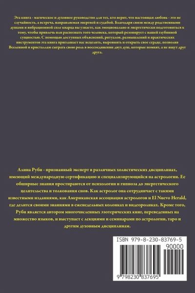 Эта книга - магическое и духовное руководство для тех, кто верит, что настоящая любовь - это не случайность, а встреча, направляемая энергией и судьбой. Благодаря связи между родственными душами и вибрационной силе кварца вы узнаете, как эмоционально и энергетически подготовиться к тому, чтобы привлечь или распознать того человека, который резонирует с вашей глубинной сущностью. С помощью доступных объяснений, ритуалов, размышлений и практических инструментов эта книга приглашает вас исцелить, выровнять и открыть свое сердце, позволив Вселенной и кристаллам сыграть свою роль в воссоединении двух душ, которые помнят, а не ищут друг друга.