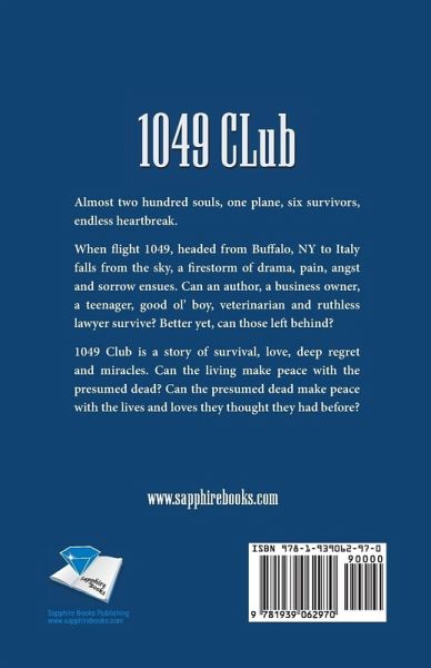 Almost two hundred souls, one plane, six survivors, endless heartbreak. When flight 1049, headed from Buffalo, NY to Italy falls from the sky, a firestorm of drama, pain, angst and sorrow ensues. Can an author, a business owner, a teenager, good ol' boy, veterinarian and ruthless lawyer survive? Better yet, can those left behind? 1049 Club is a story of survival, love, deep regret and miracles. Can the living make peace with the presumed dead? Can the presumed dead make peace with the lives and loves they thought they had before?