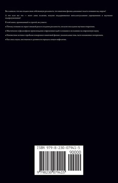 Вы слышали, что мы создаем свою собственную реальность, что квантовая физика доказывает власть сознания над миром? А что если все это - всего лишь иллюзия, искусно поддерживаемая интеллектуальными упрощениями и научными недоразумениями? В этой книге, проникающей и строгой, вы узнаете - Почему сознание не играет никакой роли в создании реальности, согласно последним научным открытиям. - Мистическое и философское происхождение современных идей о сознании и их влияние на современную науку. - Неизвестные истины о проблеме измерения в квантовой физике увлекательная тема, часто искаженная эзотеризмом. - Как смесь науки, мистицизма и духовности породила новую мифологию. Кому адресована эта книга? - Тем, кто интересуется квантовой физикой, но чувствует себя потерянным в лабиринте запутанных теорий. - Энтузиастам науки, философии и духовности, стремящимся отделить факты от искаженных интерпретаций. - Скетикам и любознательным, которые хотят понять, почему и как развились популярные идеи о творческом сознании. Что вы узнаете - Разницу между строгой наукой и мистическими интерпретациями. - Истинные философские и научные проблемы, связанные с вопросом сознания. - Почему вселенная еще более захватывающая, когда ее понимают такой, какая она есть, без искажения ее фундаментальных законов. Эта книга - не атака на духовность. Это страстная защита науки, правды и мироздания, столь же прекрасного, сколь и независимого от наших человеческих желаний. Что говорят читатели Наконец-то книга, которая развенчивает квантовую физику, не искажая ее! Произведение на пересечении философии и науки, которое освещает тему, слишком часто затуманенную. Обязательно к прочтению, если вы хотите понять, что на самом деле представляет собой квантовая физика. Готовы ли вы столкнуться с реальностью такой, какая она есть?
