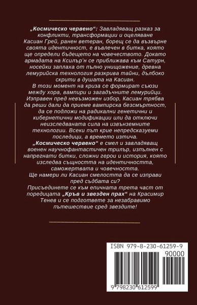 "Космическо червено" - третата книга от епичната научнофантастична поредица "Кръв и звезден прах" Потопете се в динамичния и многопластов свят, създаден от Красимир Тенев, където човешки съдби, вампирски интриги и древната мъдрост на лемурийците се преплитат със смразяващата заплаха от армадата на Ксилър'нската империя. "Космическо червено" ви отвежда на епично космическо пътешествие, докато Касиан Грей - ветеран от американската армия и войник с увреждания - се изправя пред съдбоносен избор, който ще определи не само неговата съдба, но и бъдещето на човечеството. Когато древна лемурийска технология разтърсва основите на неговата идентичност, Касиан се оказва в центъра на конфликт между три различни цивилизации. С приближаването на армадата на Ксилър'н към Сатурн, той и неговите съюзници - хора, вампири и лемурийци - са принудени да обединят сили в отчаяна битка за оцеляване. Изправен пред необходимостта да управлява усъвършенстван лемурийски изтребител, Касиан трябва да направи избор, който ще промени живота му завинаги да приеме вампирската трансформация, да се подложи на кибернетични и генетични модификации или да се довери на загадъчна извънземна технология, която може да отключи неподозирани способности. "Космическо червено" е завладяващ военен научнофантастичен трилър, изпълнен с емоционални драми, сложни герои и напрежение до последната страница. Ще успее ли Касиан да открие истинското си "аз", да преодолее вътрешните си демони и да защити човешката раса от унищожение? Защо да изберете "Космическо червено"? 1. Оригинална и многопластова история: Красимир Тенев задълбочава поредицата с вълнуващ сюжет, който изследва темите за човешката идентичност, личните борби и междувидовото съжителство. 2. Незабравими герои: Касиан, Серена, Лорън, Себастиан и останалите персонажи ще ви завладеят със сложните си съдби и емоционално развитие. 3. Убедителни научнофантастични елементи: Лемурийска технология, генно инженерство и футуристични битки придават автентичност и дълбочина на историята. 4. Запомнящи се антагонисти: Армадата на Ксилър'н