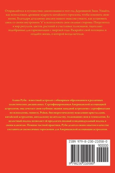 Отправляйтесь в путешествие самопознания в этот год Деревянной Змеи. Узнайте, как использовать древнюю мудрость китайского гороскопа, чтобы изменить свою жизнь. Благодаря детальному анализу вашего знака вы узнаете, как установить связь со своим внутренним "я" и использовать свои сильные стороны. Погрузитесь в мир ритуалов, цветов, растений и счастливых талисманов, тщательно подобранных для гармонизации с энергией года. Раскройте свой потенциал и создайте жизнь, о которой всегда мечтали.