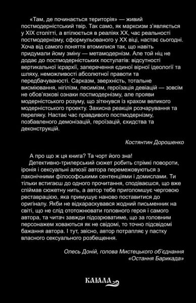 Ти прокидаєшся вранці. Поряд горнеться твоя кохана транссексуалка. За вікном роздерта по маленьких шматках сепаратистами-фанатиками країна. А за дверима світ, в який ти маєш вдертися з пістолетом, аби завершити своє ніби недовиконане завдання - ліквідацію професійної контрабандистки, в смерті якої не було сумнівів. Ти - цинічний вбивця за гроші. Ти - зрадник і коханець. Ти - жертва чужої гри. І ти забув, ким ти є насправді... Дебютний роман одеського письменника Там, де починається територія - це любовна і фантастична драма, конспірологічний і гостросюжетний детектив та філософська екзистенційна історія про аутсайдера, протягом якої йому відкриваються страшні таємниці про світ, природу людини і власне забуте минуле...