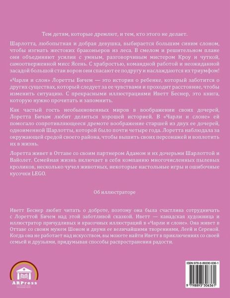 Шарлотта, любопытная и добрая девушка, выбирается большим синим слоном, чтобы изгнать жестоких браконьеров из леса. В смелом и решительном плане они объединяют усилия с умным, разговорчивым мистером Кроу и чуткой, самоотверженной мисс Ясень. С храбростью, командной работой и неожиданной засадой большой стаи ворон они спасают ее подругу и наслаждаются их триумфом! Чарли и слон Лоретты Бичем - это история о ребенке, который заботится о других существах, который следует за ее чувствами и проходит расстояние, чтобы изменить ситуацию. С прекрасными иллюстрациями Иветт Беснер, это книга, которую нужно прочитать и запомнить. Как частый гость необыкновенных миров в воображении своих дочерей, Лоретта Бичам любит делиться хорошей историей. В Чарли и слоне ей помогало сопротивляющееся дремоте воображение старшей из двух ее дочерей, одноименной Шарлотты, которой было почти четыре года. Лоретта наблюдала за окружающей средой своего района, чтобы вышить своих персонажей и воплотить их в жизнь. Лоретта живет в Оттаве со своим партнером Адамом и их дочерьми Шарлоттой и Вайолет. Семейная жизнь включает в себя компанию многочисленных пылевых кроликов, несколько чучел животных, некоторые настольные игры и ошибочные кусочки LEGO.