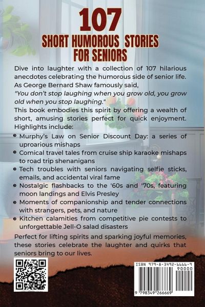 Nothing connects generations better than laughter-dive into these hilarious anecdotes involving playful, quirky, comical seniors! Seniors play an invaluable role in families and society; one that cannot be replaced. They are more than a beloved part of the family. Their unique perspective on life leads to fun-filled "clashes of generations" that make great dinner party stories and are often recollected at family events. As George Bernard Shaw once said, "You don't stop laughing when you grow old, you grow old when you stop laughing." This book pays homage to this viewpoint by celebrating one of the best things seniors bring to our lives-laughter. Within these pages, you will find 107 stories that seek to unite generations in one marvelous moment. And for even more fun, you can make it into a family activity where each family member takes their turn to read. This book makes this easy with its wealth of short, hilarious stories that can be enjoyed in just minutes. What's more, it's in large print, which means it's easy to read! Inside, you'll discover: Murphy's Law and Senior Discount Day: The day everything that could go wrong did go wrong in the most catastrophic yet hilarious way possible Fun travel stories, featuring cruise ship karaoke gone wrong, getting lost at the Louvre, and Great American road trip shenanigans Word Salad: Exactly what can go wrong when teens and seniors coincide, plus a bit of technological mayhem thrown in for good measure Retirement Ups and Downs: A road trip that ended in disaster, an exciting high-speed golf cart chase, and a heart-pounding gardening war The war between seniors and technology, from selfie sticks to mistaken emails and unwitting viral uploads, these golden oldies have got you covered Unforgettable Events from the Past: Senior antics from the '60s and '70s, plus exciting events like the moon landing and a unique celebration of the King himself, Elvis Presley A celebration of companionship-a comedy of errors at a local bingo hall, a friendship quilt with too many cooks, and the quirky invented languages that BFFs use to communicate with each other Tender stories of connection with strangers, pets, and nature... because even the most hilarious stories can stir up emotions Kitchen disasters galore, from adrenaline-charged pie contests to a Jell-O salad incident neighbors laughed about for years And much more.