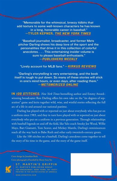 This is New York Times bestselling author and Emmy-nominated broadcaster Ron Darling's 108 baseball anecdotes that connect America's game to the men who played it. In 108 Stitches, Ron Darling offers his own take on the "six degrees of separation" game and knits together a collection of wild, wise, and wistful stories reflecting the full arc of a life in and around our national pastime. Darling has played with or reported on just about everybody who has put on a uniform since 1983, and they in turn have played with or reported on just about everybody who put on a uniform in a previous generation. Through relationships with baseball legends on and off the field, like Yale coach Smoky Joe Wood, Willie Mays, Bart Giamatti, Tom Seaver and Mickey Mantle, Darling's reminiscences reach all the way back to Babe Ruth and other turn-of-the-century greats. Like the 108 stitches on a baseball, Darling's experiences are interwoven with every athlete who has ever played, every coach or manager who ever sat in a dugout, and with every fan who ever played hooky from work or school to sit in the bleachers for a day game. Darling's anecdotes come together to tell the story of his time in the game, and the story of the game itself.