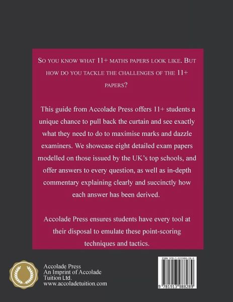 So you know what 11+ maths papers look like. But how do you tackle the unique challenges of the 11+ exams? This new guide from Accolade Press offers 11+ students a unique chance to pull back the curtain and see exactly what they need to do to maximise marks and dazzle examiners. We showcase eight detailed exam papers modelled on those issued by the UK's top schools, and offer thorough answers to every question, as well as in-depth commentary explaining exactly how each answer has been derived. Accolade Press ensures students have every tool at their disposal to emulate these point-scoring techniques and tactics ¿ Eight maths papers that mimic the length and difficulty of those issued by the UK's top private and grammar schools. Suitable for upcoming exams in 2022, 2023, 2024 and 2025. Over 280 pages. ¿ Papers cover a broad number of topics so that students can familiarise themselves with the diverse question types seen in the highly competitive 11+ field. ¿ Detailed answers for every question. ¿ In-depth explanations to accompany every answer. These clearly and succinctly explain how each and every answer has been derived. ¿ Written by experienced tutors with a stellar track-record in 7+ admissions, as well as an elite academic résumé (First Class Mathematics Degree from Warwick University; a Masters in Mathematics from The University of Oxford).