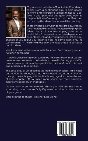 My intention with these 11 looks into Confidence comes from a continuous aim to help people reinvent and reinforce a vertical mindset. I believe in your potential and your being open to the possibilities of what you can manifest after embracing the ideas that you will be reading. These Principles of Confidence are powered by the underlined agenda to get you so highly confident that it will create a tipping point in the world full of compassionate interdependence, enlightenment, and empowerment. If I can get enough of you to put your attention on the same intentions, the world can tilt in the same direction of the hope that is in ourselves and in others. Yes, Hope is an action along with Patience. Both are very powerful when combined. Moreover, those only work when we have self-belief that we can do what we desire and the faith that we will! Getting yourself to an open-minded state of being will take the tools I put in this book and practice with repetition. The possibility of what can be learned here is priceless. Take notes and notice the thoughts that have slowed down and corrected through the tools lying within. We have pages for that at the end of every chapter. If you need more space, get more papers or clear some memory in that tablet. Do the work to get the reward. This is your life and the time to start living it well is now. Only if you're committed to the process of your growth. It takes grind to shine! Together Let's Shine!