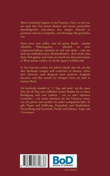 Meine Geschichte beginnt in San Francisco. Dort, wo ich war, um nach dem Tod meines Bruders und meines unmittelbar darauffolgenden Jobverlustes den nötigen Abstand zu gewinnen und um zu begreifen, was überhaupt alles geschehen war. Denn wenn man erfährt, dass der grosse Bruder - gemäss offiziellen Polizeiangaben - plötzlich an einer Lungenentzündung verstorben ist und man später - und nur dank des Auffindens eines Abschiedsbriefes - doch merkt, dass dieser Tod geplant und somit ein Suizid war, dann kann kaum in Worte gefasst werden, wie da die eigenen Gefühle sind. In San Francisco merkte ich jedoch schnell, dass ich, um das alles überhaupt ertragen und verarbeiten zu können, neben dem Schweren auch dringend einen positiven Ausgleich brauchte, und dies sowohl im richtigen Leben als auch in meinem Buch. Ich beschreibe deshalb in "11 Tage & mehr" auf der einen Seite die elf Tage vom Auffinden meines Bruders bis zu seiner Beerdigung und zum anderen - wie in einer separaten Geschichte -, wie meine Stationen seit San Francisco waren, was ich gelernt und worüber ich seither nachgedacht habe. Es gibt Trauer und Hoffnung, Einsamkeit und Dankbarkeit, Verzweiflung und Zuversicht, Freude und Schmerz, Angst und Urvertrauen.