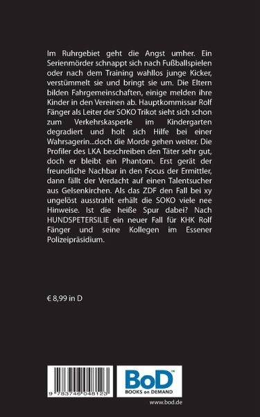 Im Ruhrgebiet geht die Angst umher. Ein Serienmörder schnappt sich nach Fußballspielen oder nach dem Training wahllos junge Kicker, verstümmelt sie und bringt sie um. Die Eltern bilden Fahrgemeinschaften, einige melden ihre Kinder in den Vereinen ab. Hauptkommissar Rolf Fänger als Leiter der SOKO Trikot sieht sich schon zum Verkehrskasperle im Kindergarten degradiert und holt sich Hilfe bei einer Wahrsagerin ... doch die Morde gehen weiter. Die Profiler des LKA beschreiben den Täter sehr gut, doch er bleibt ein Phantom. Erst gerät der freundliche Nachbar in den Focus der Ermittler, dann fällt der Verdacht auf einen Talentsucher aus Gelsenkirchen. Als das ZDF den Fall bei xy ungelöst ausstrahlt, erhält die SOKO viele neue Hinweise. Ist die heiße Spur dabei? Nach HUNDSPETERSILIE ein neuer Fall für KHK Rolf Fänger und seine Kollegen im Essener Polizeipräsidium.