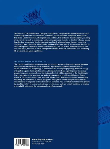 This section of the Handbook of Zoology is intended as a comprehensive and exhaustive account of the biology of the taxa Gastrotricha, Nematoda, Nematomorpha, Priapulida, Kinorhyncha, Loricifera, Gnathostomulida, Micrognathozoa, Rotifera, Seisonida and Acanthocephala, covering all relevant topics such as morphology, ecology, phylogeny and diversity. The series is intended to be a detailed and up-to-date account of these taxa. As was the case with the first edition, the Handbook is intended to serve as a reliable resource for decades.