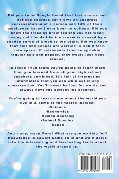 Did you know that psychopaths don't have the ability to see the negative consequences of their actions, only the positive ones. Did you know that the pyramids of Giza were more ancient to the ancient Romans than Rome is ancient to us. Did you know a study conducted by researchers at Harvard School of Public Health revealed that drinking several cups of coffee a day could reduce the risk of suicide in men and women by about 50%. In these 1100 facts you're going to learn more than you learned from all your high school teachers combined. It's full of interesting information that you can whip out in any conversation. You'll never be lost for words and always have the perfect ice breaker. You're going to learn more about the world you live in & some of the topics include: - Science - Economics - Human Anatomy - Animal Species - Space And many, many More! What're you waiting for? Knowledge is power! Come on in and we'll delve into the interesting and fascinating facts about the world around us. Scroll up and click the 'add to cart' button now!