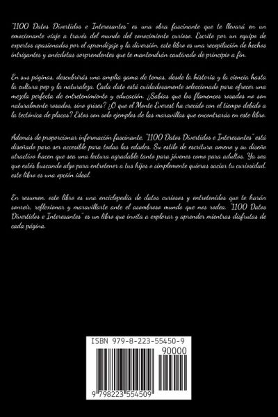 "1100 Datos Divertidos e Interesantes" es una obra fascinante que te llevará en un emocionante viaje a través del mundo del conocimiento curioso. Escrito por un equipo de expertos apasionados por el aprendizaje y la diversión, este libro es una recopilación de hechos intrigantes y anécdotas sorprendentes que te mantendrán cautivado de principio a fin. En sus páginas, descubrirás una amplia gama de temas, desde la historia y la ciencia hasta la cultura pop y la naturaleza. Cada dato está cuidadosamente seleccionado para ofrecer una mezcla perfecta de entretenimiento y educación. ¿Sabías que los flamencos rosados no son naturalmente rosados, sino grises? ¿O que el Monte Everest ha crecido con el tiempo debido a la tectónica de placas? Estos son solo ejemplos de las maravillas que encontrarás en este libro. Además de proporcionar información fascinante, "1100 Datos Divertidos e Interesantes" está diseñado para ser accesible para todas las edades. Su estilo de escritura ameno y su diseño atractivo hacen que sea una lectura agradable tanto para jóvenes como para adultos. Ya sea que estés buscando algo para entretener a tus hijos o simplemente quieras saciar tu curiosidad, este libro es una opción ideal. En resumen, este libro es una enciclopedia de datos curiosos y entretenidos que te harán sonreír, reflexionar y maravillarte ante el asombroso mundo que nos rodea. "1100 Datos Divertidos e Interesantes" es un libro que invita a explorar y aprender mientras disfrutas de cada página.