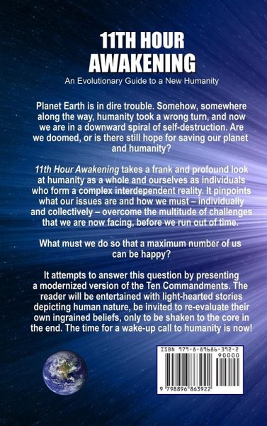 Planet Earth is in dire trouble. Somehow, somewhere along the way, humanity took a wrong turn, and now we are in a downward spiral of self-destruction. Are we doomed, or is there still hope for saving our planet and humanity? 11th Hour Awakening is a frank and profound look at humanity as a whole and ourselves as individuals who form a complex interdependent reality. It pinpoints what our issues are and how we must individually and collectively overcome the multitude of challenges that we are now facing, before we run out of time. "What must we do so that a maximum number of us can be happy?" The book attempts to answer this question by presenting a modernized version of the Ten Commandments. The reader will be entertained with light-hearted stories depicting human nature, be invited to re-evaluate their own ingrained beliefs, only to be shaken to the core in the end. The time for a wake-up call to humanity is now!