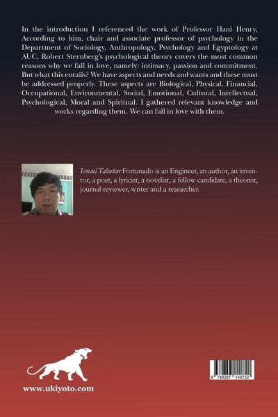 In the introduction I referenced the work of Professor Hani Henry, According to him, chair and associate professor of psychology in the Department of Sociology, Anthropology, Psychology and Egyptology at AUC, Robert Sternberg's psychological theory covers the most common reasons why we fall in love, namely: intimacy, passion and commitment. But what this entails? We have aspects and needs and wants and these must be addressed properly. These aspects are Biological, Physical, Financial, Occupational, Environmental, Social, Emotional, Cultural, Intellectual, Psychological, Moral and Spiritual. I gathered relevant knowledge and works regarding them. We can fall in love with them.