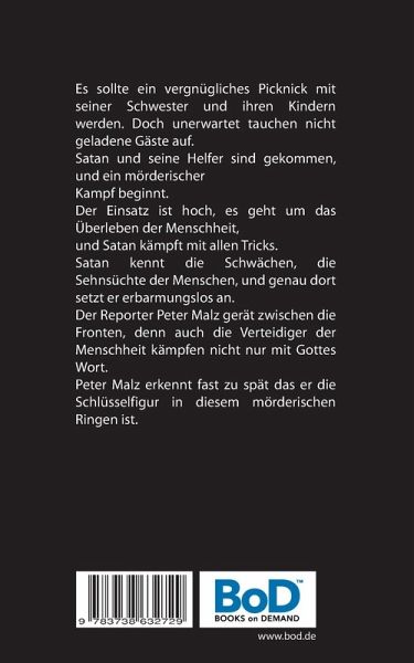 Es sollte ein vergnügliches Picknick mit seiner Schwester und ihren Kindern werden. Doch unerwartet tauchen nicht geladene Gäste auf.Satan und seine Helfer sind gekommen, und ein mörderischerKampf beginnt. Der Einsatz ist hoch, es geht um das Überleben der Menschheit,und Satan kämpft mit allen Tricks.Satan kennt die Schwächen, die Sehnsüchte der Menschen, und genau dort setzt er erbarmungslos an.Der Reporter Peter Malz gerät zwischen die Fronten, denn auch die Verteidiger der Menschheit kämpfen nicht nur mit Gottes Wort.Peter Malz erkennt fast zu spät das er die Schlüsselfigur in diesem mörderischen Ringen ist.