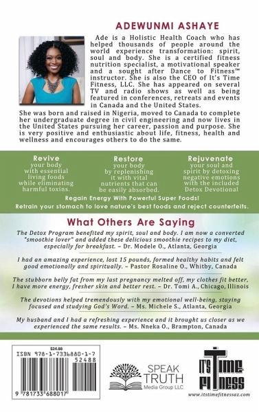 A life-changing detox program that includes meal and activity plan, grocery list and delicious smoothie recipes. Release unwanted weight, up to fifteen pounds. Revive your body with essential living foods while eliminating harmful toxins. Restore by replenishing your body with nutrients that can easily be absorbed. Retrain your stomach to love nature’s best foods and reject counterfeits. Regain energy with powerful superfoods. Rejuvenate your soul and spirit by detoxing negative emotions with the included 12 Day Power Detox Devotional.