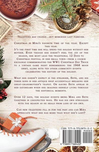 Traditions may change...but memories last forever. Christmas is Mira's favorite time of the year. Except this year. It's the first time she will spend the holiday without her mother. Even though she doesn't feel the joy of the season, she must lead the traditional 12 Days to Christmas festival in her small town--from a cookie exchange commemorating the WW1 Christmas Day Truce to a vintage game night remembering the 1968 moon orbit, along with ten other community events celebrating the history of the holiday. What she doesn't expect is the stranger, Seth, and his three sons in her antique shop accidentally breaking her great-grandmother's teapot. Or having Seth appear in her daydreams when she imagines herself living through the historical moments. Over 12 days, the holiday events bring Mira and Seth together in unexpected ways. And he has his own struggles with the season as he heals from loss of his own. Can new traditions fill in for the past and can Mira appreciate what she has more than what she's lost?