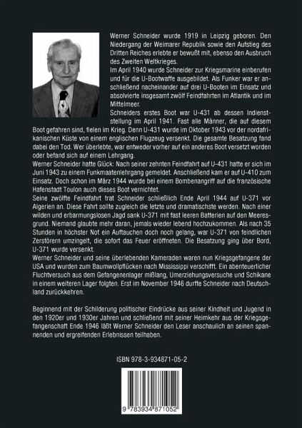 Werner Schneider wurde 1919 in Leipzig geboren. Den Niedergang der Weimarer Republik sowie den Aufstieg des Dritten Reiches erlebte er bewußt mit, ebenso den Ausbruch des Zweiten Weltkrieges. Im April 1940 wurde Schneider zur Kriegsmarine einberufen und für die U-Bootwaffe ausgebildet. Als Funker war er anschließend nacheinander auf drei U-Booten im Einsatz und absolvierte insgesamt zwölf Feindfahrten im Atlantik und im Mittelmeer. Schneiders erstes Boot war U-431 ab dessen Indienststellung im April 1941. Fast alle Männer, die auf diesem Boot gefahren sind, fielen im Krieg. Denn U-431 wurde im Oktober 1943 vor der nordafrikanischen Küste von einem englischen Flugzeug versenkt. Die gesamte Besatzung fand dabei den Tod. Wer überlebte, war entweder vorher auf ein anderes Boot versetzt worden oder befand sich auf einem Lehrgang. Werner Schneider hatte Glück: Nach seiner zehnten Feindfahrt auf U-431 hatte er sich im Juni 1943 zu einem Funkmaatenlehrgang gemeldet. Anschließend kam er auf U-410 zum Einsatz. Doch schon im März 1944 wurde bei einem Bombenangriff auf die französische Hafenstadt Toulon auch dieses Boot vernichtet. Seine zwölfte Feindfahrt trat Schneider schließlich Ende April 1944 auf U-371 vor Algerien an. Diese Fahrt sollte zugleich die letzte und dramatischste werden. Nach einer wilden und erbarmungslosen Jagd sank U-371 mit fast leeren Batterien auf den Meeresgrund. Niemand glaubte mehr daran, jemals wieder lebend hochzukommen. Als nach 35 Stunden in höchster Not ein Auftauchen doch noch gelang, war U-371 von feindlichen Zerstörern umzingelt, die sofort das Feuer eröffneten. Die Besatzung ging über Bord, U-371 wurde versenkt. Werner Schneider und seine überlebenden Kameraden waren nun Kriegsgefangene der USA und wurden zum Baumwollpflücken nach Mississippi verschifft. Ein abenteuerlicher Fluchtversuch aus dem Gefangenenlager mißlang, Umerziehungsversuche und Schikane in einem weiteren Lager folgten. Erst im November 1946 durfte Schneider nach Deutschland zurückkehren. Beginnend mit der Schilderung politischer Eindrücke aus seiner Kindheit und Jugend in den 1920er und 1930er Jahren und schließend mit seiner Heimkehr aus der Kriegsgefangenschaft Ende 1946 läßt Werner Schneider den Leser anschaulich an seinen spannenden und ergreifenden Erlebnissen teilhaben.