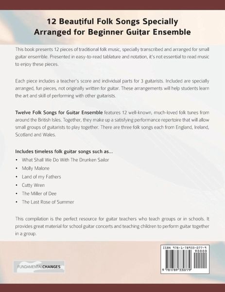 Twelve Folk Songs for Guitar Ensemble features 12 well-known, much-loved folk tunes from around the British isles. Together they make up a satisfying performance repertoire that allow small groups of guitarist to play together. There are three folk songs from England, Ireland, Scotland and Wales.