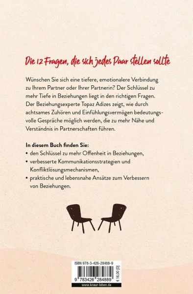 Dieser praktische Beziehungsratgeber gibt 12 achtsame Fragen an die Hand wie zum Beispiel "Was ist der Schmerz in mir, den du gerne heilen würdest?" oder "Was ist eine Erfahrung, von der du wünschst, wir hätten sie nie gemacht?". Diese Fragen öffnen nicht nur Türen zu tiefgründigen Gesprächen, sondern fördern auch die Nähe und Intimität zwischen Ihnen und Ihrem Partner oder Ihrer Partnerin.