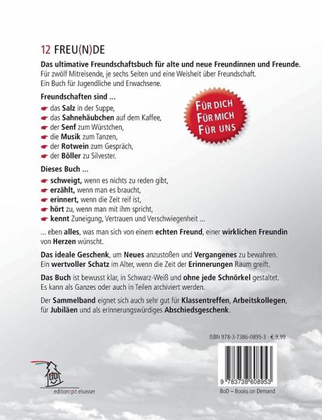 12 FREU(N)DEDas ultimative Freundschaftsbuch für alte und neue Freundinnen und Freunde.Für zwölf Mitreisende, je sechs Seiten und eine Weisheit über Freundschaft.Ein Buch für Jugendliche und Erwachsene.Freundschaften sind ...- das Salz in der Suppe, - das Sahnehäubchen auf dem Kaffee, - der Senf zum Würstchen, - die Musik zum Tanzen,- der Rotwein zum Gespräch,- der Böller zu SylvesterDieses Buch ... - schweigt, wenn es nichts zu reden gibt, - erzählt, wenn man es braucht, - erinnert, wenn die Zeit reif ist, - hört zu, wenn man mit ihm spricht,- kennt Zuneigung, Vertrauen und Verschwiegenheit ... ... eben alles, was man sich von einem echten Freund, einer wirklichen Freundin von Herzen wünscht.Das ideale Geschenk, um Neues anzustoßen und Vergangenes zu bewahren. Ein wertvoller Schatz im Alter, wenn die Zeit der Erinnerungen Raum greift. Das Buch ist bewusst klar, in Schwarz-Weiß und ohne jede Schnörkel gestaltet.Es kann als ganzes oder auch in Teilen archiviert werden. Der Sammelband eignet sich auch sehr gut für Klassentreffen, Arbeitskollegen, für Jubiläen und als erinnerungswürdiges Abschiedsgeschenk.