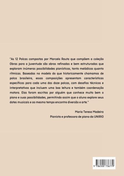 As 12 Polcas compostas por Marcelo Rauta que compõem a coleção Obras para a Juventude são obras refinadas e bem estruturadas que exploram inúmeras possibilidades pianísticas, tanto melódicas quanto rítmicas. Baseadas no modelo do que historicamente chamamos de polca brasileira, essas composições apresentam características específicas para cada uma das doze polcas, com desafios técnicos e interpretativos que incluem uma boa leitura e também coordenação motora. Elas foram escritas por alguém que conhece muito bem o piano e suas possibilidades, permitindo assim que o aluno explore seus dotes musicais e ao mesmo tempo encontre diversão e arte. Maria Teresa Madeira Pianista e professora de piano da UNIRIO