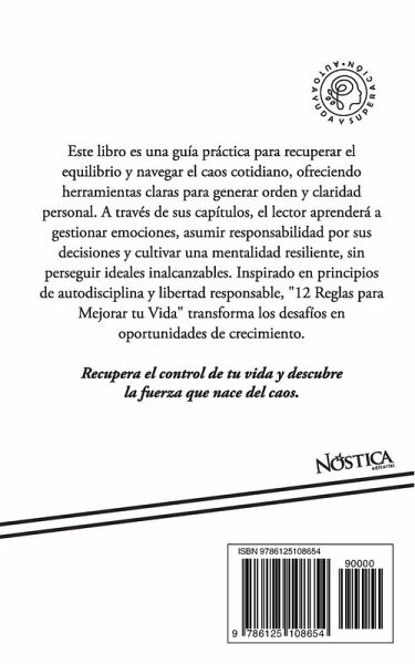 Este libro es una guía práctica para recuperar el equilibrio y navegar el caos cotidiano, ofreciendo herramientas claras para generar orden y claridad personal. A través de sus capítulos, el lector aprenderá a gestionar emociones, asumir responsabilidad por sus decisiones y cultivar una mentalidad resiliente, sin perseguir ideales inalcanzables. Inspirado en principios de autodisciplina y libertad responsable, "12 Reglas para Mejorar tu Vida" transforma los desafíos en oportunidades de crecimiento. Recupera el control de tu vida y descubre la fuerza que nace del caos.