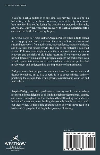 If you're in active addiction of any kind, you may feel like you're in a battle for your life, your future, or even your next twenty-four hours. You may feel like you're losing the war, feeling exposed, vulnerable, and weary. But when you enter recovery, the active addiction battle ends and the battle for recovery begins. In Twelve Steps of Armor, author Angela Pedigo offers a faith-based recovery program centered around the armor of God as a means of sustaining recovery from addictions, codependence, character defects, and life events that hinder growth. The core of the material is designed around Ephesians and explains how the armor works as it relates to recovery and the risks of old habits returning if we leave our armor behind. Interactive in nature, the program engages the participants with visual representations and/or activities which create a deeper level of involvement and understanding the importance of armoring up. Pedigo shares that people can become clean from substances and destructive habits, but to live soberly is to be sober minded, actively practicing these steps daily while growing a relationship with God and with others.