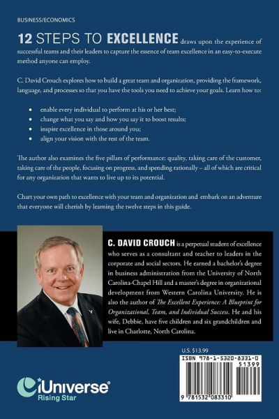 "Nobody understands the science of excellence like David Crouch." - Stephen M.R. Covey Creating excellence is an applied science. Drawing upon the experience of successful teams and their leaders, "12 Steps to Excellence" captures the essence of team excellence in an easy-to-execute method anyone can employ. Building a great team is a discipline that can be learned. How do you talk about the work you do? What's the main thing your team is trying to accomplish? What do you value so strongly that you're not willing to compromise along the way? How do customers define your quality and how do you measure it? Are you and everyone on your team building strong customer relationships? Are you impressing your customer so much that they will voluntarily and passionately talk positively to others about you? Is everyone on your team fully engaged in the work? Are you making positive forward progress? Do you have a viable strategic plan? Are you tapping into the Pareto Principle of Leadership Excellence? Can you measure all of these things? In his warm and eloquent style, David shows us step-by-step how to build a great team and organization. He gives us the framework, language, and process so that we not only have knowledge and understanding of the steps required, we also have the tools to achieve it.