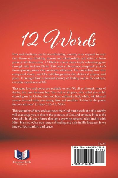 Pain and loneliness can be overwhelming, causing us to respond in ways that distort our thinking, destroy our relationships, and drive us down paths of self-destruction. 12 Words is a book about God's redeeming grace through faith in Jesus Christ. This book of devotions is inspired by God's un-surpassing power that overcame addiction, His unyielding love that conquered shame, and His unfailing promise that delivered purpose and peace. It emerged from a personal journey of finding God in the ordinary, everyday experiences of life. That same love and power are available to you! We all go through times of doubt, fear, and darkness but "the God of all grace, who called you to his eternal glory in Christ, after you have suffered a little while, will himself restore you and make you strong, firm and steadfast. To him be the power for ever and ever" (1 Peter 5:10-11, NIV). This testimony of hope and assurance that God counts each one of us worthy will encourage you to absorb the promises of God and embrace Him as the One who holds your future through a growing personal relationship with Him. He is our One true source of healing and only in His Presence do we find our joy, comfort, and peace.