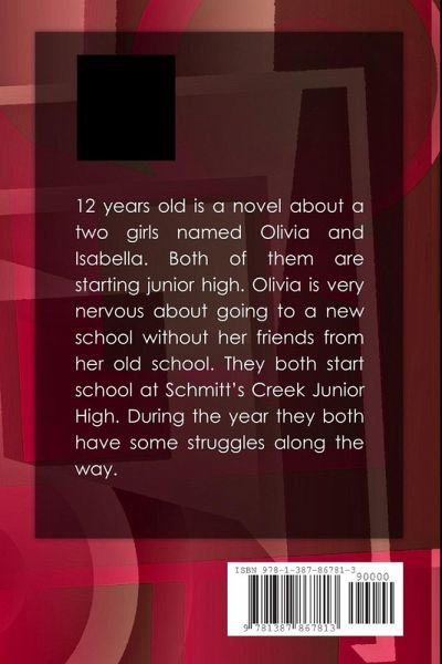 12 years old is a novel about a two girls named Olivia and Isabella. Both of them are starting junior high. Olivia is very nervous about going to a new school without her friends from her old school. They both start school at Schmitt's Creek Junior High. During the year they both have some struggles along the way.