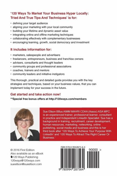 '120 Ways To Market Your Business Hyper Locally: Tried And True Tips And Techniques' is for: . defining your target audience . aligning your marketing with your local community . building your lifetime and dynamic asset value . integrating online and offline marketing techniques . collaborating effectively with complementary businesses . encouraging learning, growth, social democracy and investment It includes information for: . marketers, salespeople and advertisers . freelancers, entrepreneurs, business and franchise owners . advisers, consultants and thought leaders . coaches, trainers and mentors . community leaders and initiative instigators This thorough, practical and detailed guide provides you with the key strategies and techniques, based on your business values, that you can implement today for your success in the future. Get started and take action now! **Special free bonus offers at https://120ways.com/members This book is a companion book to '120 Ways To Achieve Your Purpose With LinkedIn' and '120 Ways To Attract The Right Career Or Business' also written by Sue Ellson.