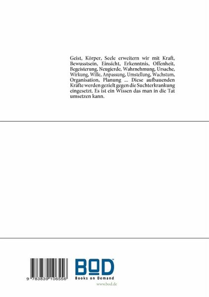Geist, Körper, Seele erweitern wir mit Kraft, Bewusstsein, Einsicht, Erkenntnis, Offenheit, Begeisterung, Neugierde, Wahrnehmung, Ursache, Wirkung, Wille, Anpassung, Umstellung, Wachstum, Organisation, Planung ... Diese aufbauenden Kräfte werden gezielt gegen die Suchterkrankung eingesetzt. Es ist ein Wissen das man in die Tat umsetzen kann.
