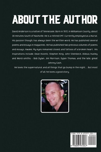David Anderson is a native of Tennessee. Born in 1972, in Williamson County, about 30 minutes South of Nashville. He is a retired EMT. Currently employed as a Nurse. His passion though, has always been the written word. He has published several poems and essays in magazines. He has published two previous volumes of poems and essays; Awake, My eyes remained closed, and Tattoos of a broken heart. His Inspirations include; Dean Koontz, Stephen King, John Steinbeck, Aldous Huxley and Word-smiths - Bob Dylan, Jim Morrison, Dylan Thomas, and the late, great Johnny Cash. He loves the supernatural, and all things that go bump in the night... But most of all, he loves a good story.