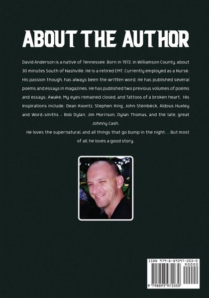 David Anderson is a native of Tennessee. Born in 1972, in Williamson County, about 30 minutes South of Nashville. He is a retired EMT. Currently employed as a Nurse. His passion though, has always been the written word. He has published several poems and essays in magazines. He has published two previous volumes of poems and essays; Awake, My eyes remained closed, and Tattoos of a broken heart. His Inspirations include; Dean Koontz, Stephen King, John Steinbeck, Aldous Huxley and Word-smiths - Bob Dylan, Jim Morrison, Dylan Thomas, and the late, great Johnny Cash. He loves the supernatural,…mehr