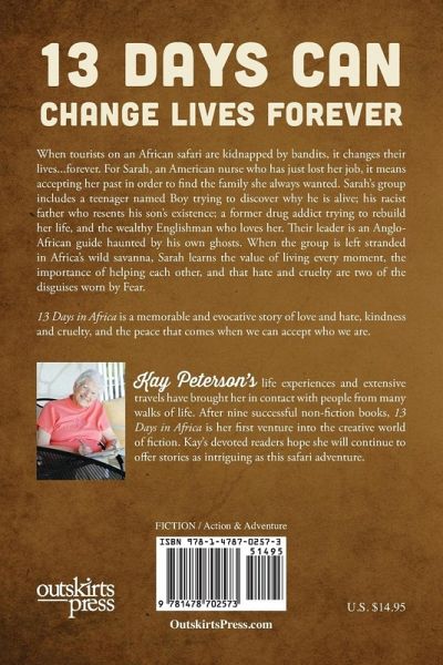 13 Days in Africa: A Safari Adventure When tourists on an African safari are kidnapped by bandits, their lives are forever changed. For Sarah, an American nurse traumatized by the recent loss of her job, it means accepting her past in order to find the family she always wanted. Her fellow travelers and their two African guides have their own issues: Tom, a white guide, is haunted by the murder of his family by blacks, while his black fellow guide blames white people for ruining his country. The guides lead a safari tour group that includes CJ, a racist who resents the 14-year-old who now questions his very existence; honeymooning Brits; a recovering addict on the mend and the wealthy Englishman who loves her. The far-flung group is pulled together by circumstance, yet dragged apart by their differences. But when the tourists are ambushed by bandits and left to fend for themselves in Africäs wild savanna, they form a bond that only comes from facing down death ¿ together. 13 Days in Africa is a memorable and evocative story of love and hate, kindness and cruelty, and the peace that comes with accepting who we are.