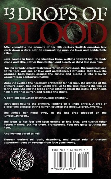 After consulting the grimoire of her 17th century Scottish ancestor, Izzy starts down a dark path to resurrect the man she loves and accidentally killed. Love candle in hand, she visualises Enzo, walking toward her, his body strong and lithe, rather than broken and bloody as she'd last seen him. Having already asked forgiveness for what she'd done, the imagined look on his face was one of love and acceptance. Harnessing that love, she wrapped both hands around the candle and placed it into a lovely wrought iron pentagram holder. Once she evoked the necessary protection for her spell, she glanced at the grimoire again, hoping her Gaelic was up to the task, hoping she was up to the task. She slid the blade of her athame across the palm of her hand, held it over her mirror, and recited the chant. A dark orb rose...then another...and another... Izzy's gaze flew to the grimoire, landing on a single phrase. A drop of blood-she glanced at the mirror, counted the drops...eleven...twelve... She jerked her hand away as the last drop plopped on the surface...thirteen... She leapt to her feet and spun around to find Enzo, and twelve other figures - there, but not there. Transparent. Feet not quite touching the floor. And looking pissed as hell. Thirteen authors tell dark, disturbing, and creepy tales of thirteen apparitions bent on revenge from love gone wrong.