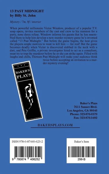 Mystery Comedy / Characters: 7 male, 9 female When powerful millionaire Victor Winslow, producer of a popular T.V. soap opera, invites members of the cast and crew to his mansion for a party, none dares refuse. Winslow informs his guests that he has assembled them to help him develop a new murder mystery game he's invented called "13 Past Midnight." But before the game begins, the host gives the players ample motives to want to kill him - for real! But the game becomes deadly when Victor is di