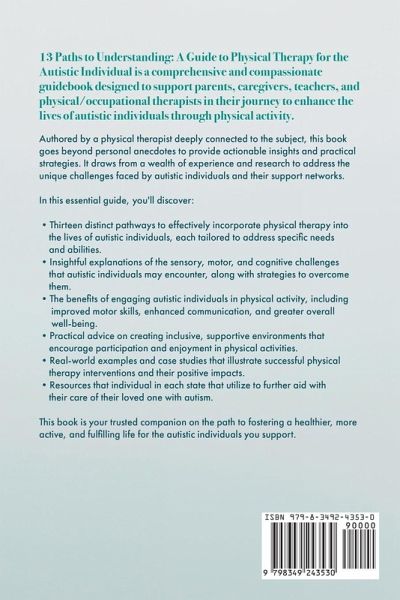 13 Paths to Understanding: A Guide to Physical Therapy for the Autistic Individual is a comprehensive and compassionate guidebook designed to support parents, caregivers, teachers, and physical/occupational therapists in their journey to enhance the lives of autistic individuals through physical activity. Authored by someone with a deeply personal connection to the subject-having been a brother to a non-verbal autistic sibling for nearly 30 years-this book goes beyond personal anecdotes to provide actionable insights and practical strategies. It draws from a wealth of experience and research to address the unique challenges faced by autistic individuals and their support networks. In this essential guide, you'll discover: Thirteen distinct pathways to effectively incorporate holistic care and physical therapy into the lives of autistic individuals, each tailored to address specific needs and abilities. Insightful explanations of the sensory, motor, and cognitive challenges that autistic individuals may encounter, along with strategies to overcome them. The benefits of engaging autistic individuals in physical activity, including improved motor skills, enhanced communication, and greater overall well-being. Practical advice on creating inclusive, supportive environments that encourage participation and enjoyment in physical activities. Real-world examples and case studies that illustrate successful physical therapy interventions and their positive impacts. Whether you are a parent striving to improve your child's quality of life, a caregiver seeking effective therapeutic techniques, a teacher aiming to create an inclusive classroom, or a therapist dedicated to making a difference, 13 Paths to Understanding offers the guidance and encouragement you need. This book is your trusted companion on the path to fostering a healthier, more active, and fulfilling life for the autistic individuals you support.