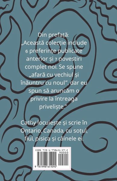 P¿¿i¿i într-o colec¿ie a autoarei canadiene Cathy McGough, în care fiecare povestire scurt¿ v¿ poart¿ în lumea unor personaje ¿i genuri noi:Prima povestire, "Dandelion Wine" a fost finalist¿ în 2019 la categoria Readers' Favourite în genul Short Story/Novela ¿i a primit CINCI STELE de la Readers Favourite. Este o retrospectiv¿ în 1967, despre o feti¿¿ "cu un scop" care tr¿ie¿te într-un or¿¿el canadian. A doua povestire, "The Brightest Star ", este o poveste de dragoste romantic¿ cu o diferen¿¿. A treia, "Reveläia lui Margaret", este despre o femeie care este luat¿ de bun¿ ¿i decide s¿ fac¿ ceva în privin¿a asta. A patra, "Umbrela ¿i vântul ", este o poveste SF care a fost publicat¿ ini¿ial într-o antologie. Este vorba despre un profesor, o umbrel¿, sticle zbur¿toare, un obiect verde uriä, umbrele ¿i arme. A cincea, "Darryl ¿i cu mine " este povestea tragic¿ a unei femei ¿i a pierderii. A ¿asea, "Death Wish ", în care protagonistul, plictisit de viäa lui de zumzet, iese în afara lui. În cele ¿APTE POVE¿TI NOI incluse ve¿i face cunötin¿¿ cu un SUPER-EROU pandemic, ve¿i auzi cum o mam¿ îi poveste¿te fiicei sale despre întâlnirea cu söul ei, ve¿i lua parte la cömarul unui vân¿tor de case, ve¿i asculta toat¿ drama unei familii care planific¿ o înmormântare în timpul covidului ¿i, în cele din urm¿, este o poveste SF despre ceva asem¿n¿tor unui covid în viitor. Înduiö¿toare, amuzant¿, dulce-amar¿, provocatoare, aceast¿ colec¿ie v¿ invit¿ s¿ s¿ri¿i în ea ¿i s¿ descoperi¿i care poveste r¿mâne cu voi cel mai mult timp. Pentru cititorii c¿rora le place o mare varietate de teme, personaje ¿i genuri cu impact de durat¿.