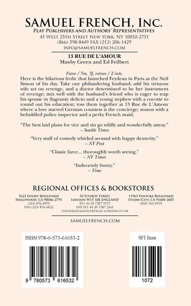 Full Length, Farce/ 5 m, 3 f, extras / 2 ints. Here is the hilarious frolic that launched Feydeau in Paris as the Neil Simon of his day. Take one philandering husband; add his virtuous wife set on revenge, and a doctor determined to be her instrument of revenge; mix well with the husband's friend who is eager to trap his spouse in flagrante delicto and a young nephew with a cocotte to round out his education; toss them together at 13 Rue de L'Amour where a love starved German countess is the co