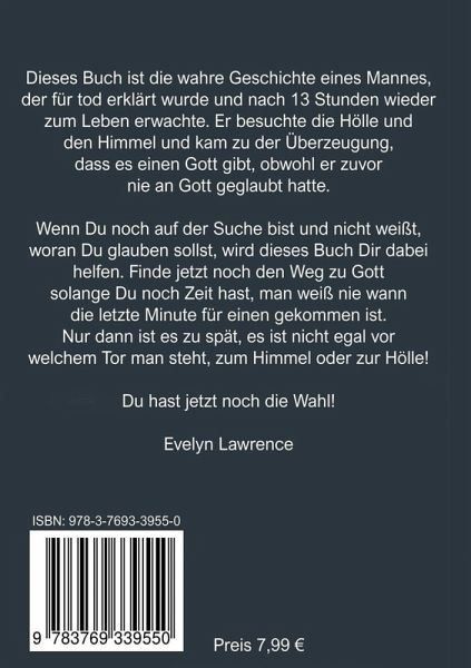 Dieses Buch ist die wahre Geschichte eines Mannes, der für tod erklärt wurde und nach 13 Stunden wieder zum Leben erwachte. Er besuchte die Hölle und den Himmel und kam zu der Überzeugung, dass es einen Gott gibt, obwohl er zuvor nie an Gott geglaubt hatte. Wenn Du noch auf der Suche bist und nicht weißt, woran Du glauben sollst, wird dieses Buch Dir dabei helfen. Finde jetzt noch den Weg zu Gott solange Du noch Zeit hast, man weiß nie wann die letzte Minute für einen gekommen ist. Nur dann ist es zu spät, es ist nicht egal vor welchem Tor man steht, zum Himmel oder zur Hölle! Du hast jetzt noch die Wahl!