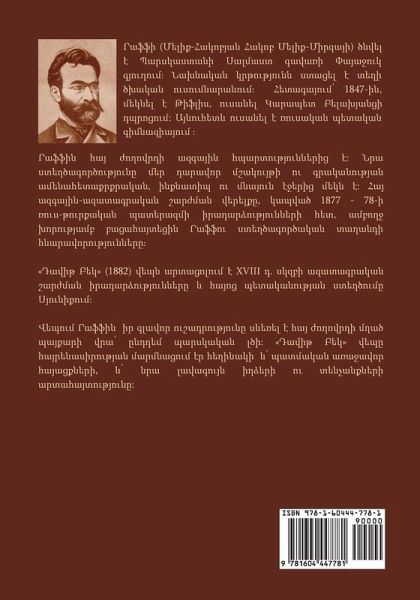 Hakob Melik Hakobian, better known by his pen name Raffi, is a renowned Armenian author born in 1835 in Payajouk, an Armenian village situated in the Salmas province (presently in the north of Iran, near Urmia Lake) in Persia. He died in 1888 in Tiflis (present-day Tbilisi). Raffi is a prominent figure of Armenian literature. The fame of Raffi is based on his tendentious novels and stories such as "Jelalleddin", "Khent", "Sparkles", "Samuel", "David-Bek" depicting the hardships the Armenian people faced. He gained insight into the baser side of mankind through real life experiences during his travels. More than once he portrays representatives of the younger generation as courageous and independent people full of sympathy for their nation and hatred towards its enemies, ready to work and struggle (E.g. Sarhat in "Jelalleddin", Vardan and Dudukchiyan in "Khent", Aslan and Karo in "Sparkles").