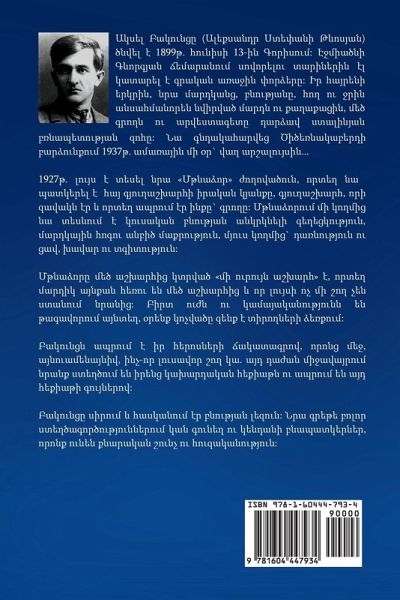Bakunts [Aksel (Axel) Bakunts (Alexander Tevosyan)] was born 1899 in Goris (Armenia) and educated at the Gevorkian Seminary in Echmiadzin. Always outspoken, his first publication, a satirical account of the mayor of Goris, earned him a stint in jail in 1915. He subsequently served as an Armenian volunteer in the battles of Erzurum, Kars and Sardarabad. Between 1918 and 1919 he was a teacher, proof-reader and reporter in Yerevan. In 1920 he was accepted to the Kharkov Institute in Ukraine to study agriculture. After graduation in 1923, he worked as an agronomist in Zangezur, a region of Armenia that features prominently in his short stories. From 1926 he settled in Yerevan where he quickly established his reputation as a gifted writer with his first collection of short stories entitled Mtnadzor [The Dark Valley]. His oeuvre includes short story collections, various individual pieces in the press, fragments of novels destroyed following his arrest in 1936, and three screenplays for films produced by Hyefilm in the 1930s. A colleague and friend of Yeghishe Charents (1897-1937), Bakunts was a member of the former's Armenian Association of Proletariat Writers. Bakunts fell victim to the Stalinist terror and was accused of various crimes including alienation from socialist society. He was arrested in 1936 and is believed to have been shot after a twenty-five minute trial in 1937. The house in Goris, Armenia, where he grew up was opened in 1957 as a museum dedicated to his life and work. (wikipedia.org)