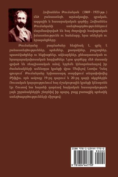 Hovhannes Tumanyan (February 19, 1869 - March 23, 1923), is considered to be one of the greatest Armenian poets and writers. His work was mostly written in tragic , sometimes humorous form, as in this title, often centering on the harsh lives of villagers in the Lori region. Tumanyan's inspiration for his writing came considerably from his parents. He was born in the village of Dsegh in the Province of Lori, Armenia. With his father was an offspring of an Armenian princely family of Tumanian (branch of the Mamikonians) and the village's priest and his mother an avid storyteller with a particular interest in fables, Tumanyan had incorporated many of the themes from his mother's stories and his father's preachings into his writings. Tumanyan is usually regarded in Armenian circles as "All-Armenian poet". He earned this title when the Catholicos of Armenia had ordered that Armenian refugees from the west not enter certain areas of his church and house, since he is considered to be "The Catholicos of all Armenians". Tumanyan in response decried that decision claiming that the refugees could seek relief in the Catholicos' quarters under order of "The Poet of all Armenians".