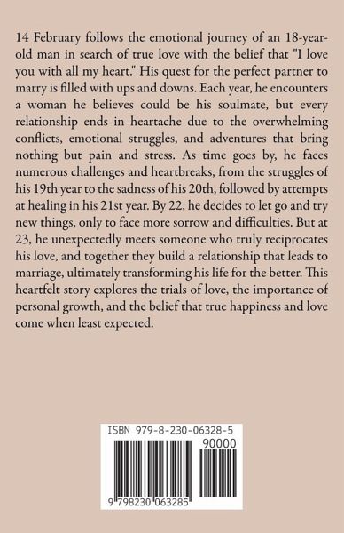 14 February follows the emotional journey of an 18-year-old man in search of true love with the belief that "I love you with all my heart." His quest for the perfect partner to marry is filled with ups and downs. Each year, he encounters a woman he believes could be his soulmate, but every relationship ends in heartache due to the overwhelming conflicts, emotional struggles, and adventures that bring nothing but pain and stress. As time goes by, he faces numerous challenges and heartbreaks, from the struggles of his 19th year to the sadness of his 20th, followed by attempts at healing in his 21st year. By 22, he decides to let go and try new things, only to face more sorrow and difficulties. But at 23, he unexpectedly meets someone who truly reciprocates his love, and together they build a relationship that leads to marriage, ultimately transforming his life for the better. This heartfelt story explores the trials of love, the importance of personal growth, and the belief that true happiness and love come when least expected.