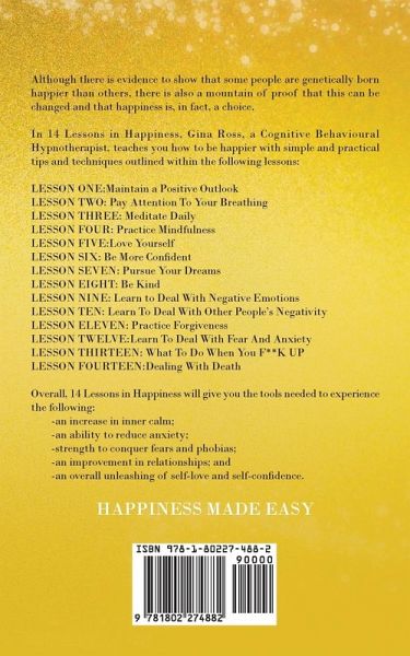 HAPPINESS MADE EASY *Please send blurb to proofreader. There are some spacing issues after the colons* Although there is evidence to show that some people are genetically born happier than others, there is also a mountain of proof that this can be changed and that happiness is, in fact, a choice. In 14 Lessons in Happiness, Gina Ross, a Cognitive Behavioural Hypnotherapist, teaches you how to be happier with simple and practical tips and techniques outlined within the following lessons: LESSON ONE:Maintain a Positive Outlook LESSON TWO: Pay Attention To Your Breathing LESSON THREE: Meditate Daily LESSON FOUR: Practice Mindfulness LESSON FIVE:Love Yourself LESSON SIX: Be More Confident LESSON SEVEN: Pursue Your Dreams LESSON EIGHT: Be Kind LESSON NINE: Learn to Deal With Negative Emotions LESSON TEN: Learn To Deal With Other People's Negativity LESSON ELEVEN: Practice Forgiveness LESSON TWELVE:Learn To Deal With Fear And Anxiety LESSON THIRTEEN: What To Do When You F\*\*K UP LESSON FOURTEEN:Dealing With Death Overall, 14 Lessons in Happiness will give you the tools needed to experience the following: \-an increase in inner calm; \-an ability to reduce anxiety; \-strength to conquer fears and phobias; \-an improvement in relationships; and \-an overall unleashing of self-love and self-confidence.