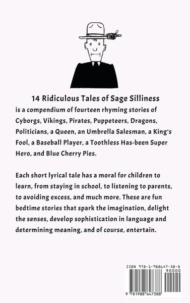 14 Ridiculous Tales of Sage Silliness is a compendium of fourteen rhyming stories of Cyborgs, Vikings, Pirates, Puppeteers, Dragons, Politicians, a Queen, an Umbrella Salesman, a Baseball Player, and a Toothless Has-been Super Hero. Each short lyrical tale has a moral for children to learn, from staying in school, to listening to parents, to avoiding excess, and much more. These are fun bedtime stories that spark the imagination, delight the senses, develop sophistication in language and determining meaning, and of course, entertain.
